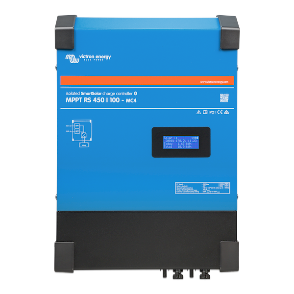 The Victron SmartSolar MPPT RS 450 | 100 is an ultra-high-voltage MPPT controller supporting up to 450V PV input and delivering 100A charging output for 24V and 48V battery systems. Designed for large off-grid installations and high-voltage PV arrays, it includes Bluetooth, VE.Can, VE.Direct, and advanced MPPT tracking.